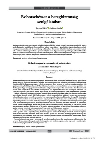 A robotasszisztált sebészet a sebészeti technikák legújabb fejlődési szintjét képviseli, amely egyre szélesebb körben kerül alkalmazásra hazánkban is. A robotsebészet számos szakterületen – így például a nőgyógyászatban, urológiában, gasztrointesztinális, máj- és hasnyálmirigy-sebészetben – bizonyított előnyöket kínál a precíziós műtéti technikák, a csökkent műtéti megterhelés és a gyorsabb felépülés révén. Ugyanakkor a magas költségek, a hosszabb tanu lási görbe és a haptikus visszajelzés hiánya továbbra is kihívást jelent. A robotsebészet fejlődése és integrációja hazánkban kulcsszerepet játszik a sebészi betegellátás modernizálásában és a betegbiztonság növelésében. | Robot-assisted surgery represents a transformative advancement in the evolution of minimally invasive surgical techniques, driven by the overarching goal of reducing perioperative trauma and enhancing patient safety. Building on the foundation laid by laparoscopic surgery, robotic systems now allow surgeons to perform complex operations with greater precision, flexibility, and control. The widespread adoption of robotic platforms across various specialties – including gynecology, urology, gastrointestinal, hepatic, and pancreatic surgery – has demonstrated clear clinical benefits such as lower complication rates, shorter recovery times, and improved functional and oncological outcomes. The Hungarian experience with robotic surgery began in early 2022 and rapidly expanded across institutions and specialties. Robotic surgery offers distinct advantages across different surgical specialties, tailored to the specific anatomical and technical demands of each field. In liver surgery, robotic systems facilitate minimally invasive access to anatomically challenging lesions, especially in posterior liver segments, and enable refined dissection through 3D visualization and tremor-free instrument control. Pancreatic surgery, including robotic pancreatoduodenectomy, benefits from improved ergonomics and lower morbidity compared to open techniques. Meanwhile, in rectal surgery, robotic platforms excel in narrow pelvic spaces, reducing conversion rates and preserving functional outcomes. In gynecology, robotic surgery enables highly precise dissection in confined anatomical spaces, supporting its role in both benign and oncologic procedures. Urology, one of the earliest adopters, continues to benefit from the precision and nervesparing potential of robotic systems, particularly in prostate and kidney cancer surgeries. Despite its clear clinical benefits, robotic surgery faces challenges: high acquisition and maintenance costs, extended operative times – especially during the learning phase – and the lack of haptic feedback. However, improvements such as the tactile simulation in the latest Da Vinci systems and structured training programs (including drylab simulation) are addressing these limitations. Strategic patient selection and institutional centralization further enhance cost-effectiveness and patient safety. In conclusion, robotic surgery is not merely a technological milestone but a patient-centered innovation that serves to elevate safety and surgical quality. Its integration into modern surgical practice represents a crucial step toward delivering high-standard, minimally invasive care.