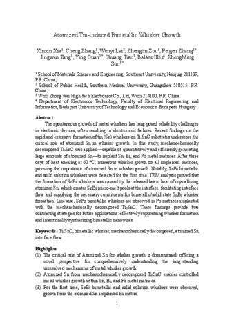 Xinxin, Xia and Cheng, Zhang and Wenyi, Lai and Zhenglin, Zou and Peigen, Zhang and Jingwen, Tang and Ying, Guan and Shuang, Tian and Illés, Balázs and ZhengMing, Sun (2025) Atomized Tin-induced Bimetallic Whisker Growth. MATERIALS CHARACTERIZATION, 224. No.-115060. ISSN 1044-5803