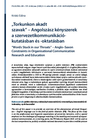 A tanulmány célja, hogy áttekintést nyújtson a public relations (PR) szakterületén tapasztalható magyar–angol kevert nyelvhasználat jelenségéről. A vizsgálat fókuszában az egyetemi oktatókra nehezedő szakmai és nyelvi elvárások állnak, különös tekintettel a nyelvi megfeleltetés kihívásaira a szervezeti kommunikáció oktatásában és kutatásában. Kiindulópontként a 2021-es PR-iparági jelentés szolgál, amely az utolsó átfogó, nyilvánosan elérhető hazai dokumentumként hiteles képet nyújt a szakma aktuális nyelvhasználati tendenciáiról, illetve a közönséghez szóló nyelvi gyakorlatokról. A tanulmány rámutat arra, hogy a tudományos igényű, ugyanakkor nyelvileg árnyalt kommunikáció mind az oktatók, mind a tudományos ismeretterjesztéssel foglalkozó szakemberek számára komoly dilemmákat vet fel. A teljes nyelvi megfeleltetés sok esetben lehetetlen, ugyanakkor a terminológia mechanikus átvétele, a fordítás teljes mellőzése sem kínál kielégítő megoldást. E kettősség nyelvhasználati és oktatásmódszertani vonatkozásainak feltárása révén a tanulmány a tudományos nyelvhasználat tudatosításához kíván hozzájárulni a nyelvi idegenség és alkalmazkodás kontextusában. | The aim of this paper is to provide an overview of the phenomenon of mixed Hungarian – English language use in the field of public relations (PR). The focus of the study is on the professional and linguistic expectations of university lecturers, with a special emphasis on the challenges of language matching in the teaching and research of organisational communication. As a starting point, the PR Industry Report 2021 will be used as the last comprehensive, publicly available national document to provide a credible picture of current language use trends in the profession and language practices aimed at the public. The study shows that communicating in a scientifically demanding yet linguistically nuanced way poses serious dilemmas for both educators and practitioners of scientific communication. While full linguistic compliance is often impossible, the mechanical adoption of terminology and the complete absence of translation are not satisfactory solutions. By exploring the linguistic and methodological aspects of this dichotomy, the study aims to contribute to the awareness of scientific language use in the context of linguistic alienation and adaptation.