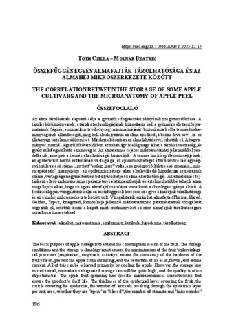 Az alma tárolásának alapvető célja a gyümölcs fogyasztási idényének meghosszabbítása. A tárolás körülményeinek, a tárolás technológiájának biztosítania kell a gyümölcs élettani folyamatainak (légzés, enzimatikus tevékenység) minimalizálását, biztosítania kell a termés húskeménységének állandóságát, meg kell akadályoznia az alma apadását, a benne lévő sav-, íz- és illatanyag-tartalom csökkenését. Mindezt elsősorban az alma lehűtésével érhetjük el. A hagyományos, normál légterű hűtőtárolókban azonban így is elég nagy lehet a tárolási veszteség, és gyakran kifogásolható a minőség is. Az almatermés sajátos mikroanatómiai jellemzőkkel rendelkezik, amelyek a termés eltarthatóságát biztosítják. A termés borító epidermiszsejtjeinek, az epidermiszt borító kutikulának vastagsága, az epidermiszréteget áttörő lenticellák egységnyi területre eső száma, „nyitott” estleg „zárt” volta, az egységnyi felületre eső sztómák, „mikrorepedések” mennyisége, az epidermisz rétege alatt elhelyezkedő hipoderma sejtsorainak száma, vastagsága nagymértékben befolyásolhatja az alma eltarthatóságát. Az almatermés fajtánként eltérő mikroanatómiai paraméterei alátámaszthatják és értelmezhetőbbé tehetik azon megállapításokat, hogy az egyes almafajták tárolásra vonatkozó technológiai igénye eltérő. A fentiek alapján vizsgálatunk célja az összefüggések keresése az egyes almafajták tárolhatósága és az almahéj mikroszerkezete között volt. Vizsgálataink során hat almafajta (Florina, Idared, Golden, Topaz, Jonagored, Remo) héja jellemző mikroanatómiai paramétereinek vizsgálatát végeztük el, vetettük össze a kapott mért eredményeket az ezen almafajták tárolhatóságára vonatkozó ismeretekkel. | The basic purpose of apple storage is to extend the consumption season of the fruit. The storage conditions and the storage technology must ensure the minimization of the fruit’s physiological processes (respiration, enzymatic activity), ensure the constancy of the hardness of the fruit's flesh, prevent the apple from shrinking, and the reduction of its acid, flavor, and aroma content. All of this can be achieved primarily by cooling the apple. However, the storage loss in traditional, normal-air refrigerated storage can still be quite high, and the quality is often objectionable. The apple fruit (pomum) has specific microanatomical characteristics that ensure the product’s shelf life. The thickness of the epidermal layer covering the fruit, the cuticle covering the epidermis, the number of lenticels breaking through the epidermis layer per unit area, whether they are ”open” or ”closed”, the number of stomata and ”microcracks” per unit area, the number of cell rows of the hypodermis located under the epidermis layer, its thickness can greatly affect the shelf life of the apple. The different microanatomical parameters of the apple fruit (pomum) per cultivar can support and make more interpretable the findings that the technological requirements of each apple cultivar for storage are different. Based on the above, the purpose of our study was to find correlations between the storability of each apple cultivar and the microstructure of the apple peel. In the course of our research, we examined the characteristic microanatomical parameters of the peel of six apple cultivars (Florina, Idared, Golden, Topaz, Jonagored, Remo), and compared the obtained measured results with the knowledge about the storability of these apple varieties.
