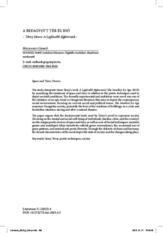 The study interprets János Térey’s work A Legkisebb Jégkorszak (The Smallest Ice Age, 2015) by examining the treatment of space and time in relation to the poetic techniques used to depict societal conditions. The formally experimental and ambitious verse novel was one of the initiators of an epic trend in Hungarian literature that aims to depict the contemporary social environment, focusing on current social and political issues. The Smallest Ice Age examines Hungarian society, primarily the lives of the residents of Svábhegy, in a crisis and borderline situation, during and after a natural disaster. The paper argues that the fundamental tools used by Térey’s novel to represent society (focusing on the mental and social well-being of individuals, families, cities, and the country) are the unique poetic devices of space and time, as well as a set of formal techniques: narrative games and metalepsis (that inventively rethink genre conventions), the occasional use of genre patterns, and metrical and poetic diversity. Through the dialectic of chaos and harmony, the formal characteristics of the novel depict the state of society and the changes taking place.