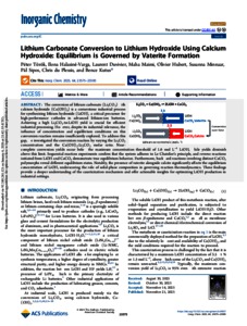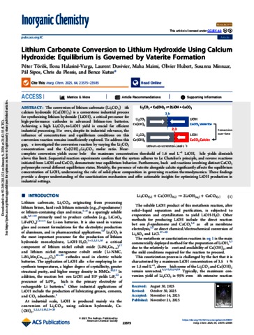 Torok, Peter and Halasine-Varga, Ilona and Duvivier, Laurent and Maimi, Maha and Hubert, Olivier and Minnaar, Susanna and Sipos, Pál Miklós and du, Plessis Chris and Kutus, Bence (2025) Lithium Carbonate Conversion to Lithium Hydroxide Using Calcium Hydroxide: Equilibrium is Governed by Vaterite Formation. INORGANIC CHEMISTRY, 64 (48). pp. 23575-23585. ISSN 0020-1669