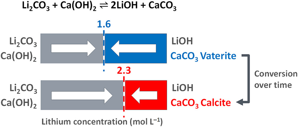 The conversion of lithium carbonate (Li2CO3) with calcium hydroxide (Ca(OH)2) is a cornerstone industrial process for synthesizing lithium hydroxide (LiOH), a critical precursor for high-performance cathodes in advanced lithium-ion batteries. Achieving a high Li2CO3-to-LiOH yield is crucial for efficient industrial processing. However, despite its industrial relevance, the influence of concentration and equilibrium conditions on this conversion reaction remains insufficiently explored. To address this gap, we investigated the conversion reaction by varying the Li2CO3 concentration and the Ca(OH)2:Li2CO3 molar ratio. Near-complete conversion yields occur below the maximum concentration threshold of 1.6 mol L-1 LiOH, while yields diminish above this limit. Sequential reaction experiments confirm that the system adheres to Le Chatelier's principle, and reverse reactions initiated from LiOH and CaCO3 demonstrate true equilibrium behavior. Furthermore, backward reactions involving distinct CaCO3 polymorphs reveal different equilibrium states. Notably, the presence of vaterite alongside calcite significantly affects the equilibrium concentration of LiOH, underscoring the role of solid-phase composition in governing reaction thermodynamics. These findings provide a deeper understanding of the causticization mechanism and offer actionable insights for optimizing LiOH production in industrial settings.
