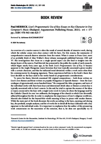 Kaczmarczyk, Adrienne (2025) Liszt's Programmatic Use of Key: Essays on Key Character in One Composer's Music. STUDIA MUSICOLOGICA: AN INTERNATIONAL JOURNAL OF MUSICOLOGY OF THE HUNGARIAN ACADEMY OF SCIENCES, 66 (1-2). pp. 157-161. ISSN 1788-6244