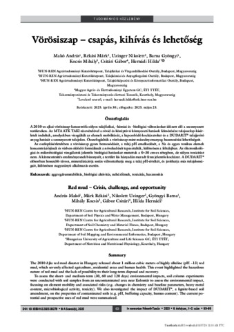 A 2010-es ajkai vörösiszap-katasztrófa súlyos talajfizikai, -kémiai és -biológiai változásokat idézett elő a szennyezett területeken. Az MTA ATK TAKI részvételével a rövid és középtávú környezeti hatások felmérésére talajoszlop-kísér- letek indultak, amelyekben vizsgálták az elemek mobilitását, a kapcsolódó kockázatokat és a DUDARIT® talajjavító anyag hatását a szennyezett talajokra. Összefoglalták a vörösiszap mint másodnyersanyag hasznosítási lehetőségeit. Az oszlopkísérletekben a vörösiszap gyors bemosódását, a talaj-pH emelkedését, a Na és egyes toxikus elemek koncentrációjának és vízben oldódó formáiknak a növekedését tapasztalták, különösen a feltalajban. Az ökotoxikoló- giai és mikrobiológiai vizsgálatok jelentős biológiai hatásokat mutattak a 0–30 cm-es rétegben, de súlyos toxicitást nem. A kármentesítés eredményesnek bizonyult, a terület kis hányadán maradt fenn jelentős kockázat. A DUDARIT® elősorban hosszabb távon, mineralizációja során változtathatja meg a talaj pH-értékét, és javíthatja más tulajdonsá- gait, különösen nagyarányú alkalmazás esetén. | The 2010 Ajka red mud disaster in Hungary released about 1 million cubic meters of highly alkaline (pH ~13) red mud, which severely affected agriculture, residential areas and human health. This event highlighted the hazardous nature of red mud and the lack of possibility to their long-term disposal and recovery. To assess the short- and medium-term (30, 60 and 120 days) environmental impacts, soil column experiments were conducted with soil samples from an uncontaminated area near Kolontár to assess the environmental impact, focusing on element mobility and associated risks (e.g. changes in chemistry and baseline parameters, heavy metal content, microbiological activity, toxicity). We also investigated the impact of DUDARIT®, a lignite-based soil amendment, on the properties of contaminated soils (e.g. pH, buffering capacity, humus content). The current potential and prospective uses of red mud were summarized. The results of the laboratory column experiment at the MTA ATK TAKI showed rapid infiltration of red mud, which led to an increase in soil pH, sodium and in some cases the toxic element concentrations and increased the water-soluble levels of As, Co, Cr, Cu, Ni, Pb and Zn, especially in the topsoil. Ecotoxicological studies showed significant biological effects in the 0–30 cm layer, but no severe toxicity. In some cases, microbial populations and plant germination were increased, indicating resistance and adaptation to contamination. Remediation has been effective, with a small part of the site remaining at significant risk. Our results show that DUDARIT® soil amendment can change soil pH and improve other properties, especially at higher application rates, in the longer term, during mineralization. According to the literature red mud is a hazardous waste, but also can be used as a secondary raw material in industry, for metal recovery, environmental protection and circular economy, if appropriate technologies are applied.