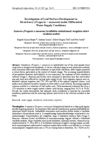 Simon-Gáspár, Brigitta and Simon, Szabina and Gellért, Gergely Tóth and Péter, Szabó (2025) Investigation of Leaf Surface Development in Strawberry (Fragaria × ananassa) under Differential Water Supply Conditions = Szamóca (Fragaria x ananassa) levélfelület-alakulásának vizsgálata eltérő vízellátás mellett. GEORGIKON FOR AGRICULTURE: A MULTIDISCIPLINARY JOURNAL IN AGRICULTURAL SCIENCES, 29 (1). pp. 26-31. ISSN 0239-1260