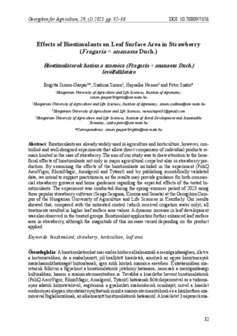 Simon-Gáspár, Brigitta and Simon, Szabina and Hajnalka, Nemes and Péter, Szabó (2025) Effects of Biostimulants on Leaf Surface Area in Strawberry (Fragaria × ananassa Duch.) = Biostimulátorok hatása a szamóca (Fragaria × ananassa Duch.) levélfelületére. GEORGIKON FOR AGRICULTURE: A MULTIDISCIPLINARY JOURNAL IN AGRICULTURAL SCIENCES, 29 (1). pp. 32-38. ISSN 0239-1260