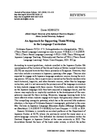 Horváth Dávid recenziója Uchikawa Kazumi 卒業論文と日本語教育: TBLL(Thesis Based Language Learning)の理念と実践. Thesis Writing and Japanese Language Teaching: Philosophy and Practice of TBLL (Thesis Based Language Learning). [Szakdolgozat és japánnyelv-oktatás: A TBLL (szakdolgozat-alapú nyelvtanulás) filozófiája és gyakorlata. Tokió: Coco Suppan ココ出版, 2024.