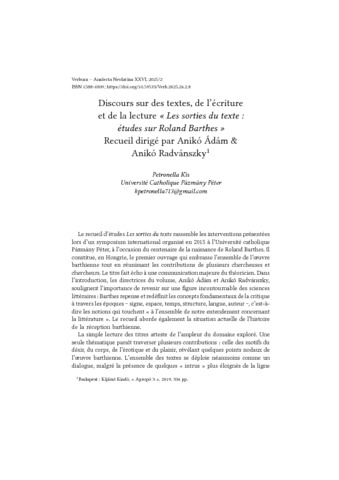Kis, Petronella and Matuz, Bence (2025) Discours sur des textes, de l’écriture et de la lecture « Les sorties du texte : études sur Roland Barthes » Recueil dirigé par Anikó Ádám & Anikó Radvánszky. VERBUM: ANALECTA NEOLATINA, 26 (2). pp. 293-296. ISSN 1585-079X
