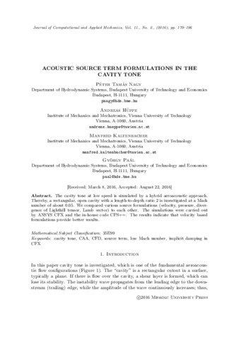 Nagy, Péter Tamás and Hüppe, Andreas and Kaltenbacher, Manfred and Paál, György (2016) Acoustic source term formulations in the cavity tone. JOURNAL OF COMPUTATIONAL AND APPLIED MECHANICS, 11 (2). pp. 179-196. ISSN 1586-2070