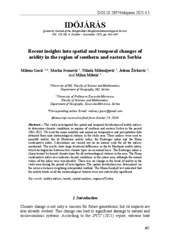 Gocic, Milena and Ivanovic, Marko and Milentijevic, Nikola and Zivkovic, Jelena and Miletic, Milan (2025) Recent insights into spatial and temporal changes of aridity in the region of southern and eastern Serbia. IDŐJÁRÁS / QUARTERLY JOURNAL OF THE HUNGARIAN METEOROLOGICAL SERVICE, 129 (4). pp. 465-484. ISSN 0324-6329