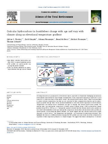 Nooten, Sabine S. and Kárpáti, Zsolt and Neumayer, Johann and Becsi, Benedikt and Formayer, Herbert and Schmitt, Thomas (2026) Cuticular hydrocarbons in bumblebees change with age and vary with climate along an elevational temperature gradient. SCIENCE OF THE TOTAL ENVIRONMENT, 1014. No. 181310. ISSN 0048-9697