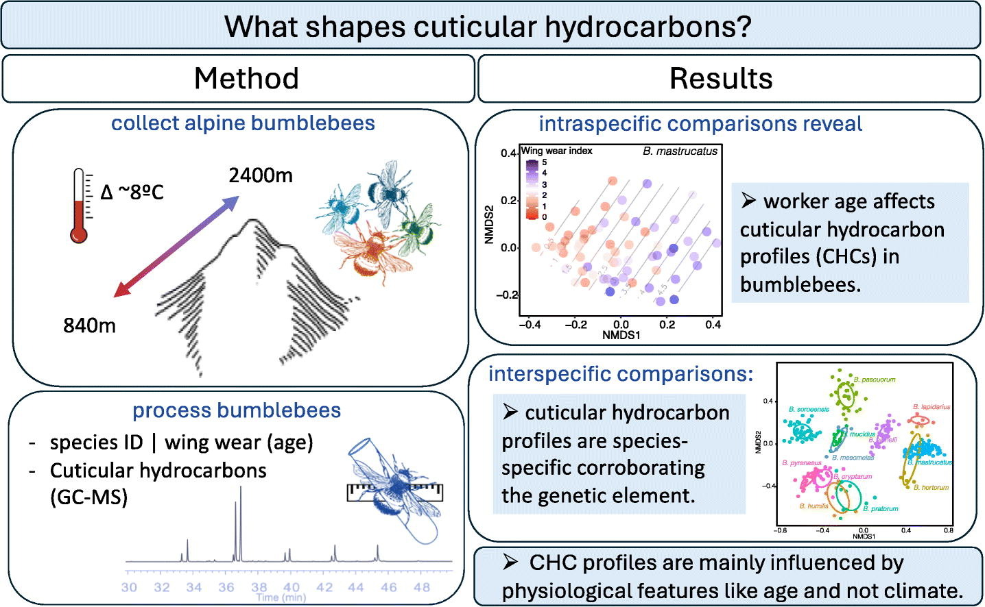 Avoiding desiccation is paramount for all terrestrial insects, especially in climatically challenging mountainous environments characterised by rapid changes in temperature. A key component in the insects' repertoire to avoid water loss is a thin waxy layer on the insects' cuticle - the cuticular hydrocarbons (CHCs). These can be modified to reduce cuticular transpiration, but they are also restricted by their communication function and by physiological properties like age. Here, we use montane bumblebees to assess the relative importance of abiotic features (temperature) and internal factors (relatedness and age) in ‘shaping’ the cuticular hydrocarbon profiles. We perform inter- and intraspecific comparisons of twelve species collected along a 1560 m elevational climate gradient (from 800 to 2400 m a.s.l.). Intraspecific analyses revealed that the cuticular hydrocarbon profiles are associated with bumblebee worker age. Interspecific comparisons showed that cuticular hydrocarbon profiles are species-specific corroborating the genetic element. Our results suggest that the cuticular hydrocarbon profile responses to abiotic factors - like temperature and humidity - are constrained by physiological features. This highlights the intricacy of different features shaping the CHC profiles and raises issues about the acclimatisation capability of these important pollinators to climate changes. We suggest that future investigations of cuticular hydrocarbon profiles should incorporate physiological features that are related to fitness, such as the insects' nutrition, body size and fat content.