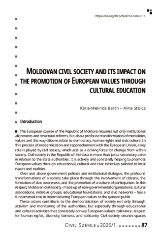 Barth, Karla Melinda and Stoica, Alina (2026) Moldovan civil society and its impact on the promotion of European values through cultural education. CIVIL SZEMLE, 23 (1). pp. 87-102. ISSN 1786-3341