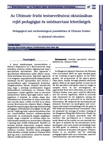 A hazai mindennapos testnevelésben a Nemzeti Alaptanterv és a Kerettantervek meglehetősen részletes célokat fogalmaznak meg a sportjátékok oktatásában. Alsó tagozaton a sportjátékok előkészítése zajlik, főként testnevelési játékokon keresztül, míg felső tagozattól az öt megadott csapatjáték közül évfolyamonként minimum két-két sportjátékot kell oktatni a testnevelőknek egyre komplexebb formában. Vizsgálatunkban három irányból közelítettük meg, hogy a jelenlegi szabályozásba hogyan illeszkedhetne hatékonyan az Ultimate frizbi csapatsport, melyet egyelőre csak az alternatív környezetben űzhető sportágak között említ a jogalkotó. A kisjáték- és taktika alapú oktatásmódszertan nemzetközi és hazai szakirodalmát vetettük össze a 2020. évi NAT és az ahhoz tartozó Kerettantervek céljaival. Majd a Magyar Repülő Korong Országos Sportági Szakszövetség pedagógus-továbbképzési stratégiáját vettük górcső alá. Végül egy húsz tanórás kutatásban részt vett testnevelőkkel készített mélyinterjúinkat elemeztük. Az eredmények alapján megállapíthatjuk, hogy a kisjáték- és taktikai alapú tanítási/tanulási módszertan bevezetésére alkalmas a sportág akár ötödik évfolyamtól. Emellett az inváziós játékok alapvetéseit integrált módon megjeleníteni képes sportágként releváns testnevelésórai tartalom. Továbbá olyan pedagógiai célok elérésére is kiváló eszköz az Ultimate frizbi sportág, mint a koedukáció, asszertív kommunikáció, önálló játékvezetés. | In Hungarian physical education the National Core Curriculum (NAT) set quite detailed goals in the teaching of sports games. In the lower grades, the preparation of the sports games takes place, mainly through physical education games, while in the upper grades, at least two of the five specified team games must be taught in complex form. In our investigation, we approached from three directions as to how the Ultimate frisbee team sport could fit effectively into the current regulation, which is currently only mentioned by the legislator among the sports that can be practiced in an alternative environment. We compared the international and domestic literature on small-game and tacticbased educational methodology with the goals of NAT 2020 and National Frame Curriculum. Then we examined the strategy of teacher training of the Hungarian Flying Disc Federation. Finally, we analyzed our in-depth interviews with PE teachers who participated in a twenty-hour study. Based on the results, we can conclude that the sport is suitable for the introduction of the small-game and tactic-based methodology from the fifth grade. In addition, it can display the basic elements of invasion ball games. Ultimate frisbee is an excellent tool for achieving pedagogical goals such as co-education, assertive communication, and self-refereeing.