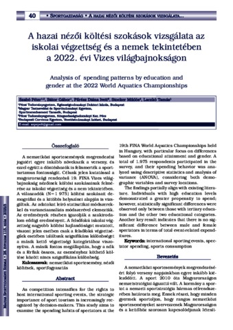 Szabó, Péter and Bátor, Gábor László and Fűrész, D I and Stocker, Miklós and Laczkó, Tamás (2025) A hazai nézői költési szokások vizsgálata az iskolai végzettség és a nemek tekintetében a 2022. évi Vizes világbajnokságon = Analysis of spending patterns by education and gender at the 2022 World Aquatics Championships. MAGYAR SPORTTUDOMÁNYI SZEMLE, 26 (3(115)). pp. 40-47. ISSN 1586-5428