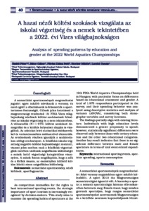 A nemzetközi sportesemények megrendezési jogaiért egyre inkább növekszik a verseny, és ezzel együtt a döntéshozók is felismerték a sportturizmus fontosságát. Célunk jelen kutatással a magyarországi rendezésű 19. FINA Vizes világbajnokság nézőinek költési szokásainak felmérése az iskolai végzettség és a nem tekintetében. A válaszadók (N=1 975) költési szokásait demográfiai és a kitöltés helyszínei alapján is vizsgáltuk. Az adatokat leíró statisztikai módszerekkel és varianciaanalízis módszerével elemeztük. Az eredmények részben igazolják a szakirodalom eddigi eredményeit. A felsőfokú iskolai végzettség nagyobb költési hajlandóságot mutatott, viszont jelen esetben csak a felsőfokú végzettségűek esetében találtunk szignifikáns különbséget a másik kettő végzettségi kategóriához viszonyítva. A másik fontos megállapítás, hogy a nők és a férfiak összes, az eseményhez köthető költése között nincs szignifikáns különbség. | As competition intensifies for the rights to host international sporting events, the strategic importance of sport tourism is increasingly recognized by decision-makers. This study aims to examine the spending habits of spectators at the 19th FINA World Aquatics Championships held in Hungary, with particular focus on differences based on educational attainment and gender. A total of 1.975 respondents participated in the survey, and their spending behavior was analyzed using descriptive statistics and analysis of variance (ANOVA), considering both demographic variables and survey locations. The findings partially align with existing literature. Individuals with high education levels demonstrated a greater propensity to spend; however, statistically significant differences were observed only between those with tertiary education and the other two educational categories. Another key result indicates that there is no significant difference between male and female spectators in terms of total event-related expenditures.