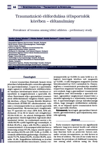 A korai traumatikus élmények hosszú távon jelentősen befolyásolhatják a mentális egészséget és a sportteljesítményt. A sport és a sportközösségek egyszerre működhetnek védőfaktorként, de bizonyos körülmények között kockázati tényezőként is megjelenhetnek a sportolók életében. Kutatásunk célja a gyermekkori traumatizáció előfordulásának vizsgálata felnőtt sportolók körében, a Korai Trauma Kérdőív Rövidített Változatának (ETISR-SF) alkalmazásával, valamint a versenysportolók és az amatőr sportolók összehasonlítása. Keresztmetszeti vizsgálatunkban 77 sportoló vett részt (55% férfi, 45% nő), életkoruk 18 és 58 év között volt (átlagéletkor: 32,04±9,08 év). Az adatok feldolgozása SPSS programmal, bináris logisztikus regresszió alkalmazásával történt. Az eredmények szerint a kitöltők 89,5%-a jelölt legalább egy traumafajtát. A férfiak 85,4%-a, míg a nők 94,3%-a számolt be traumatizációról. A versenysportolók körében az érintettség aránya 97,3%, míg az amatőr sportolók esetében 82,5% volt (OR=5,08; p=0,058). A traumák előfordulási gyakorisága: általános traumák 73,7%, fizikai 64,5%, érzelmi 56,6%, szexuális 18,4%. Szignifikáns különbség az érzelmi traumatizációt illetően mutatkozott, amely a versenysportolók (p=0,038) és azon belül is a válogatott kerettagok körében volt magasabb (p=0,035). A nők lényegesen magasabb érzelmi bántalmazásról (p=0,01) számoltak be. Összességében a traumatizáció prevalenciája mindkét csoportban magasnak bizonyult. Eredményeink arra utalnak, hogy a gyermekkori traumatizáció önmagában nem determinálja a sportolói státuszt, ugyanakkor meghatározó tényező lehet a mentális egészség és a teljesítmény szempontjából. A sportközösségek szerepe kulcsfontosságú abban, hogy támogató védőhálóként működjenek, és ne váljanak újabb traumatizáció forrásává a sportolók életében. | Early traumatic experiences can significantly influence long-term mental health and athletic performance. Sport and sports communities may function both as protective factors and, under certain circumstances, as risk factors in the lives of athletes. The aim of our study was to examine the prevalence of childhood traumatization among adult athletes using the Early Trauma Inventory Self Report-Short Form (ETISR-SF), and to compare competitive and amateur athletes. In our cross-sectional study, 77 athletes participated (55% male, 45% female), aged between 18 and 58 years (32.04±9.08 years). Data were processed with SPSS software using binary logistic regression. Results showed that 89.5% of respondents reported at least one type of trauma. Among men, 85.4% reported traumatization, while among women, this ratio was 94.3%. The prevalence was 97.3% in competitive athletes compared to 82.5% in amateur athletes (OR=5.08; p=0.058). The frequencies of trauma types were as follows: general trauma 73.7%, physical 64.5%, emotional 56.6%, sexual 18.4%. A significant difference was found regarding emotional traumatization, which was higher among competitive athletes (p=0.038), particularly in national team members (p=0.035). Women reported significantly higher levels of emotional abuse (p=0.01). Overall, the prevalence of traumatization proved to be high in both groups. Our findings suggest that childhood traumatization does not in itself determine athlete status, but it can be a decisive factor in terms of mental health and performance. The role of sports communities is crucial in ensuring that they function as a supportive safety net rather than becoming sources of further traumatization in athletes’ lives.