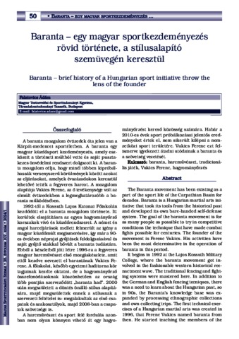 A baranta mozgalom évtizedek óta jelen van a Kárpát-medencei sportéletben. A baranta egy magyar küzdősport kezdeményezés, amely eszközeit a történeti múltból vette és saját pusztakezes önvédelmi rendszert dolgozott ki. A baranta mozgalom célja, hogy minél többen kipróbálhassák versenyszerű körülmények között azokat az eljárásokat, amelyek évszázadokon keresztül lehetővé tették a fegyveres harcot. A mozgalom alapítója Vukics Ferenc, az ő tevékenysége volt az elmúlt évtizedekben a legmeghatározóbb a baranta működésében. 1992-től a Kossuth Lajos Katonai Főiskolán kezdődött el a baranta mozgalom története. Itt kerültek elsajátításra az egyes hagyományőrző korszakok vívó és küzdőrendszerei. A német és angol harceljárások mellett felmerült az igény a magyar küzdőmúlt megismerésére, így már a 90- es években néprajzi gyűjtések feldolgozásával és saját gyűjtő utakkal bővült a baranta tudástára. Ebből a készletből jött létre 1996-ra a fegyveres magyar harcművészet első mozgáskészlete, amit ettől kezdve nevezett el barantának Vukics Ferenc. A főiskolai, később egyetemi haditorna kör tagjainak kezdte oktatni, de a hagyományőrző összefonódásoknak köszönhetően az ország több pontján szerveződött „baranta had”. 2000 után megszületett a döntés önálló stílus alapítására, majd megszülettek ennek a stílusnak a szervezeti feltételei is: megalakultak az első csapatok és szakosztályok, majd 2008-ban a csapatok szövetsége is. A harcművészet és sport felé fordulás azonban nem olyan könnyen vihető át egy hagyományőrzést kereső közösség számára. Habár a 2010-es évek sport próbálkozásai jelentős eredményeket értek el, nem sikerült kilépni a nemzetközi sport területére. Vukics Ferenc ezt felismerve igyekezett átadni utódainak a baranta és a szövetség vezetését. | The Baranta movement has been existing as a part of the sport life of the Carpathian Basin for decades. Baranta is a Hungarian martial arts initiative that took its tools from the historical past and developed its own bare-handed self-defense system. The goal of the baranta movement is for as many people as possible to try in competitive conditions the technique that have made combat fights possible for centuries. The founder of the movement is Ferenc Vukics. His activities have been the most determinative in the operation of baranta in this period. It begins in 1992 at the Lajos Kossuth Military College, where the baranta movement got involved in the fashionable western historical reenactment wave. The traditional fencing and fighting systems were mastered here. In addition to the German and English fencing tecniques, there was a need to learn about the Hungarian past, so in 90s, the Baranta’s knowledge base was expanded by processing ethnographic collections and own collecting trips. The first technical exercises of a Hungarian martial arts was created in 1996, that Ferenc Vukics named baranta from then. He started teaching the members of the