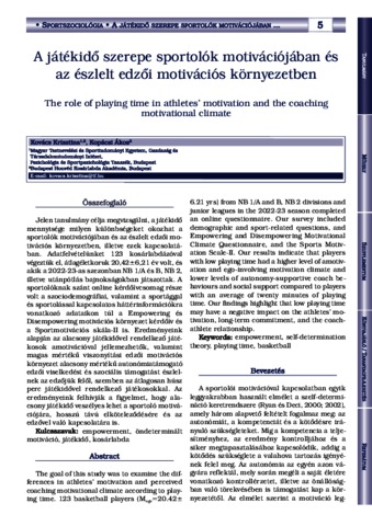Jelen tanulmány célja megvizsgálni, a játékidő mennyisége milyen különbségeket okozhat a sportolók motivációjában és az észlelt edzői motivációs környezetben, illetve ezek kapcsolatában. Adatfelvételünket 123 kosárlabdázóval végeztük el, átlagéletkoruk 20,42±6,21 év volt, és akik a 2022-23-as szezonban NB 1/A és B, NB 2, illetve utánpótlás bajnokságokban játszottak. A sportolóknak szánt online kérdőívcsomag része volt a szociodemográfiai, valamint a sportággal és sportolással kapcsolatos háttérinformációkra vonatkozó adataikon túl a Empowering és Disempowering motivációs környezet kérdőív és a Sportmotivációs skála-II is. Eredményeink alapján az alacsony játékidővel rendelkező játékosok amotivációval jellemezhetők, valamint magas mértékű viszonyítási edzői motivációs környezet alacsony mértékű autonómiatámogató edzői viselkedést és szociális támogatást észlelnek az edzőjük felől, szemben az átlagosan húsz perc játékidővel rendelkező játékosokkal. Az eredményeink felhívják a figyelmet, hogy alacsony játékidő veszélyes lehet a sportoló motivációjára, hosszú távú elköteleződésére és az edzővel való kapcsolatára is. | The goal of this study was to examine the differences in athletes’ motivation and perceived coaching motivational climate according to playing time. 123 basketball players (Mage=20.42± 6.21 yrs) from NB 1/A and B, NB 2 divisions and junior leagues in the 2022-23 season completed an online questionnaire. Our survey included demographic and sport-related questions, and Empowering and Disempowering Motivational Climate Questionnaire, and the Sports Motivation Scale-II. Our results indicate that players with low playing time had a higher level of amotivation and ego-involving motivation climate and lower levels of autonomy-supportive coach behaviours and social support compared to players with an average of twenty minutes of playing time. Our findings highlight that low playing time may have a negative impact on the athletes’ motivation, long-term commitment, and the coachathlete relationship.