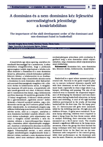 A kosárlabda egy olyan sportág, amelyben kiemelkedő fontossággal bír a szimmetria. A siker érdekében elengedhetetlen, hogy a játékosok egyenrangúan tudják végrehajtani a labdás technikai elemeket a domináns és a nem domináns kézzel is, jellemzően a közeli dobásokat (például: fektetett dobás), a labdavezetést és az átadásokat. Kutatásunk célja a kosárlabda oktatás során a domináns és nem domináns oldal fejlesztésének sorrendi fontosságának vizsgálata volt, a fektetett dobás és labdavezetés során. A vizsgálatban összesen 45 jobb kezes, a kosárlabdát először tanuló gyermek vett részt. A fektetett dobásnál 21 tizenhárom éves leányt, míg a labdavezetés esetében összesen 24 nyolcéves gyermeket (9 fiú, 15 leány) vizsgáltunk. A fektetett dobás méréséhez a gyermekeknek „egyleütés ziccert” kellett dobniuk a büntető sarokról indulva, míg a labdavezetés esetén egy 2x15 méteres pályát kellett időre teljesíteniük. Az eredmények alapján szignifikáns különbség mutatkozott a fektetett dobás mérése során, ahol az a csoport, amelyben a nem domináns kezükkel tanulták először a fektetett dobás technikáját, jobb teljesítményt mutatott a vizsgálat utolsó mérésén a nem domináns oldalon a kontrollcsoporthoz képest, míg a domináns oldali teljesítményük megegyezett. Azonban a labdavezetés oktatása és mérése során nem volt megfigyelhető hatása a sorrendiségnek. Véleményünk szerint, a mért adatok alapján mindenképpen megfontolandó lenne a fektetett dobás tanítását a nem domináns kézzel kezdeni, mivel ezen módszert alkalmazva végeredményképpen jelentősen jobb eredmény figyelhető meg a nem domináns oldali teljesítményben, míg a domináns oldali teljesítményben nincs különbség. | Basketball is a sport where symmetry plays a crucial role. Success in the game requires players to execute technical elements equally well with their dominant as well as their non-dominant hand, especially in close-range shots (e.g., layups), dribbling, and passing. The aim of our research was to examine the sequential importance of developing the dominant and non-dominant sides during basketball education, in layup shots and dribbling. A total of 45 right-handed children participated in the study, all learning basketball for the first time. For the layup practice, 21 thirteen-year-old girls were assessed, while for the dribbling exercise, 24 eight-year-old children (9 boys, 15 girls) were evaluated. To assess layup shooting, children were required to shoot a layup from the free-throw corner, while to analyze dribbling, their execution time was measured on a 2x15-meter track. The results showed a significant difference in the layup measurements, where the group that first learned the layup technique with their non-dominant hand performed better in the final test on the nondominant side compared to the control group, while their performance on the dominant side was the same. However, no observable differencewas found between the groups in dribbling performance. In our opinion, based on the measured data, it would be worth considering teaching layup shots starting with the non-dominant hand, as employing this method ultimately results in significantly better performance on the non-dominant side, while there is no difference in the dominant hand’s performance.
