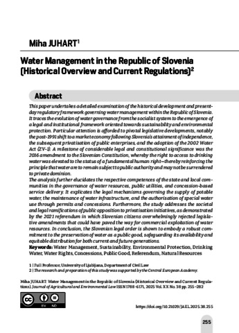 Juhart, Miha (2025) Water Management in the Republic of Slovenia (Historical Overview and Current Regulations). AGRÁR- ÉS KÖRNYEZETJOG / JOURNAL OF AGRICULTURAL AND ENVIRONMENTAL LAW, 20 (38). pp. 255-282. ISSN 3058-0447