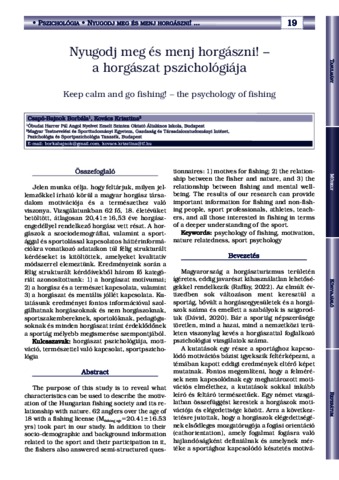 Jelen munka célja. hogy feltárjuk, milyen jellemzőkkel írható körül a magyar horgász társadalom motivációja és a természethez való viszonya. Vizsgálatunkban 62 fő, 18. életévüket betöltött, átlagosan 20,41±16,53 éve horgászengedéllyel rendelkező horgász vett részt. A horgászok a szociodemográfiai, valamint a sportággal és sportolással kapcsolatos háttérinformációkra vonatkozó adataikon túl félig strukturált kérdéseket is kitöltöttek, amelyeket kvalitatív módszerrel elemeztünk. Eredményeink során a félig strukturált kérdőívekből három fő kategóriát azonosítottunk: 1) a horgászat motívumai; 2) a horgász és a természet kapcsolata, valamint 3) a horgászat és mentális jóllét kapcsolata. Kutatásunk eredményei fontos információval szolgálhatnak horgászoknak és nem horgászoknak, sportszakembereknek, sportolóknak, pedagógusoknak és minden horgászat iránt érdeklődőnek a sportág mélyebb megismerése szempontjából. | The purpose of this study is to reveal what characteristics can be used to describe the motivation of the Hungarian fishing society and its relationship with nature. 62 anglers over the age of 18 with a fishing license (Mfishing age=20.41±16.53 yrs) took part in our study. In addition to their socio-demographic and background information related to the sport and their participation in it, the fishers also answered semi-structured questionnaires: 1) motives for fishing; 2) the relationship between the fisher and nature, and 3) the relationship between fishing and mental wellbeing. The results of our research can provide important information for fishing and non-fishing people, sport professionals, athletes, teachers, and all those interested in fishing in terms of a deeper understanding of the sport.