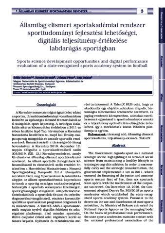 Sáfár, Sándor and Kovács, Kristóf and Juhász, Péter and Baji, Balázs (2023) Államilag elismert sportakadémiai rendszer sporttudományi fejlesztési lehetőségei, digitális teljesítmény-értékelése labdarúgás sportágban = Sports science development opportunities and digital performance evaluation of a state-recognized sports academy system in football. MAGYAR SPORTTUDOMÁNYI SZEMLE, 24 (3 (103). pp. 3-11. ISSN 1586-5428