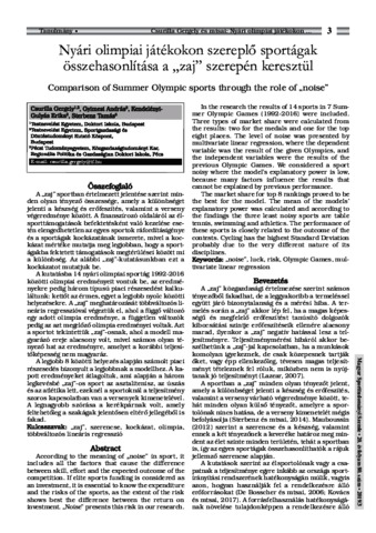 A „zaj” sportban értelmezett jelentése szerint minden olyan tényező összessége, amely a különbséget jelenti a készség és erőfeszítés, valamint a verseny végeredménye között. A finanszírozó oldaláról az élsporttámogatások befektetésként való kezelése esetén elengedhetetlen az egyes sportok ráfordításigénye és a sportágak kockázatának ismerete, mivel a kockázat mértéke mutatja meg legjobban, hogy a sportágakba fektetett támogatások megtérülései között mi a különbség. Az alábbi „zaj”-kutatásunkban ezt a kockázatot mutatjuk be. A kutatásba 14 nyári olimpiai sportág 1992-2016 közötti olimpiai eredményeit vontuk be, az eredményekre pedig három típusú piaci részesedést kalkuláltunk: kettőt az érmes, egyet a legjobb nyolc közötti helyezésekre. A „zaj” meghatározását többváltozós lineáris regresszióval végeztük el, ahol a függő változó egy adott olimpia eredménye, a független változók pedig az azt megelőző olimpia eredményei voltak. Azt a sportot tekintettük „zaj”-osnak, ahol a modell magyarázó ereje alacsony volt, mivel számos olyan tényező hat az eredményre, amelyet a korábbi teljesítőképesség nem magyaráz. A legjobb 8 közötti helyezés alapján számolt piaci részesedés bizonyult a legjobbnak a modellhez. A kapott eredményeket átlagoltuk, ami alapján a három legkevésbé „zaj”-os sport az asztalitenisz, az úszás és az atlétika lett, ezeknél a sportoknál a teljesítmény szoros kapcsolatban van a versenyek kimenetelével. A legnagyobb szórása a kerékpárnak volt, amely feltehetőleg a szakágak jelentősen eltérő jellegéből is fakad. | According to the meaning of „noise” in sport, it includes all the factors that cause the difference between skill, effort and the expected outcome of the competition. If elite sports funding is considered as an investment, it is essential to know the expenditure and the risks of the sports, as the extent of the risk shows best the difference between the return on investment. „Noise” presents this risk in our research. In the research the results of 14 sports in 7 Summer Olympic Games (1992-2016) were included. Three types of market share were calculated from the results: two for the medals and one for the top eight places. The level of noise was presented by multivariate linear regression, where the dependent variable was the result of the given Olympics, and the independent variables were the results of the previous Olympic Games. We considered a sport noisy where the model's explanatory power is low, because many factors influence the results that cannot be explained by previous performance. The market share for top 8 rankings proved to be the best for the model. The mean of the models’ explanatory power was calculated and according to the findings the three least noisy sports are table tennis, swimming and athletics. The performance of these sports is closely related to the outcome of the contests. Cycling has the highest Standard Deviation probably due to the very different nature of its disciplines.