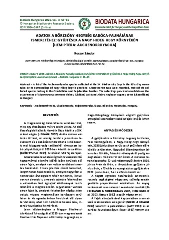 Koczor, Sándor (2025) Adatok a Börzsöny-hegység kabóca-faunájának ismeretéhez: gyűjtések a Nagy-Hideg-hegy környékén (Hemiptera: Auchenorrhyncha). BIODATA HUNGARICA : A MAGYAR BIODIVERZITÁS-KUTATÓ TÁRSASÁG FOLYÓIRATA, 3. pp. 58-65. ISSN 3004-0647