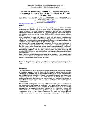 Csabai, Judit and Bankó, Gábor and Kosztyuné Krajnyák, Edit and Cushman, John C. and Mengistu, Mitiku A. and Szabó, Béla (2025) Water Use Efficiency of teff (Eragrostis Tef (ZUCC.) TROTTER) Breeding Lines Under Different Irrigation Treatments. In: Fenntartható Tájgazdálkodási Tudományos Műhely konferenciája 2025 : Innovatív megoldások a XXI. század mezőgazdaságában. Nyíregyházi Egyetem, Műszaki és Agrártudományi Intézet, Nyíregyháza, pp. 104-111. ISBN 9786156032836