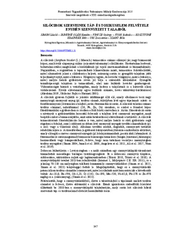 Simon, László and Irinyiné Oláh, Katalin and Vincze, György and Vigh, Szabolcs and Kosztyuné Krajnyák, Edit and Uri, Zsuzsanna and Szabó, Béla (2025) Silócirok szerveinek táp- és toxikuselem-felvétele enyhén szennyezett talajból = Nutrient and Toxic Element Uptake in Silage Sorghum Organs from a Moderately Contaminated Soil. In: Fenntartható Tájgazdálkodási Tudományos Műhely konferenciája 2025 : Innovatív megoldások a XXI. század mezőgazdaságában. Nyíregyházi Egyetem, Műszaki és Agrártudományi Intézet, Nyíregyháza, pp. 147-156. ISBN 9786156032836