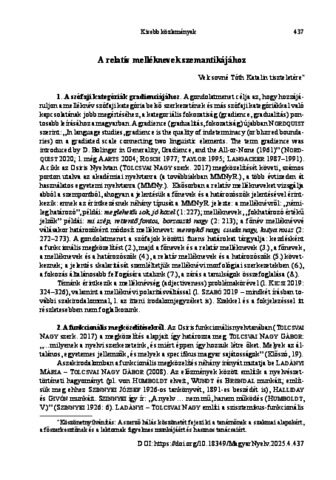 A cikk a melléknév kategória jelentésintenzitásának skaláris természetét elemzi. Javasol egy olyan leírást, amely a melléknév kategória belső szerkezetének és más szófaji kategóriákkal való kapcsolatának jobb megértéséhez vezet, s hozzájárul a kategoriális fokozatiság pontosabb megértéséhez. A nyelvi komponensszerkezeteket és ezek konstrukcióit mutatja be, amelyek jelentésük skaláris jellegét szolgálják. Az írás tárgyát a holista funkcionális megközelítés nézőpontjából szemléli (Tolcsvai Nagy szerk. 2017), hozzákapcsolva magyar nyelvtani előzményeket is. A cikk a szótárak, irodalmi szövegek, a hétköznapi nyelvhasználat nyelvi anyagára koncentrál a relatív melléknevek és szófaji kapcsolódásaik körében. Kiemeli, hogy a szófaji kategóriák gradienciája a lexikai jelentésből, az absztrakcióból, a sematizációból és a szintaktikai funkciókból táplálkozik. A jelentés skaláris természetét a szövegbeli funkciók és a közös figyelmi jelenet beszédcselekvései érvényesítik: értékelés, minősítés, elismerés, gúnyolódás, túlzás. A példákban a nyelvi funkciókon kívül stilisztikai, retorikai, publicisztikai és e-nyelvi hatások is jelen vannak. | This article seeks to contribute to describing the category gradience of Hungarian adjectives, while also outlining their features linking them to other form classes. The approach used builds on the holistic cognitive perspective (Osiris Nyelvtan, 2017), highlighting traditional Hungarian grammatical legacy. The way Hungarian language expresses the intensity of the meaning behind certain words takes centre stage, based on everyday language use, records in dictionaries, and examples in literature. These linguistic facts reflect stylistic, rhetorical, publicity-related, and e-linguistic effects, too. Thus, they illustrate nicely, how the gradience of form classes can be derived from the meaning found in dictionaries, from abstraction, schematization, and syntactic features. The scalarity of meaning is created by the role a given word plays in the text, and by the acts of speech completed during a scene of shared attention.