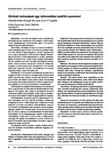 Bevezetés: A kórházi tartozásállomány mértékének, változásainak és hatásainak bemutatása a közfinanszírozott egészségügyi ellátóhálózat egyik informatikai beszállítójának a szemszögéből.Célkitűzés: Elemzésünk célja a kórházi tartozásállomány vizsgálata egy kórházi információs rendszert szállító piaci szereplő szemszögéből, kiemelt figyelemmel arra, hogy a szolgáltató KKV elérhető kintlévőség adatiból milyen összefüggések mutathatók be, illetve milyen hatások érvényesülnek az irányában fennálló tartozás mértékének változásában. Célunk feltárni azokat az okokat és hatásokat, amelyek a közfinanszírozott szolgáltatók informatikai szállítóval szemben fennálló tartozásának volumenét meghatározzák, illetve befolyásolják.Módszerek: Az retrospektív elemzéshez az adatokat a vizsgált kórházi információs rendszer szállítójának saját adatai biztosították, illetve a nyilvánosan elérhető országos kórházi tartozásállomány adatok adják. Az elemzés során szignifikancia szinteket és korrelációs együtthatókat vizsgáltunk különböző statisztikai módszerekkel.Eredmények: A vizsgálat eredményeként kimutathatóvá válik, hogy az állami konszolidációs beavatkozásoktól függően sok egyéb helyi hatás is befolyásolja az adott intézmény fizetési hajlandóságát, illetve a tartozások felhalmozásának dinamikáját.Következtetés: Az adatok elemzése, az okok őszinte feltárása, hatásainak vizsgálata és azok intézményenkénti összehasonlítása bemutatja, hogy a központi konszolidációtól függetlenül sok egyéb szempont is befolyásolja a tartozásállomány változás dinamizmusát. Ezeknek az okoknak a detektálása és kezelése lehetőséget ad a kórházi tartozások csökkentésére, az egészségügyi beszállítók finanszírozási terheinek az enyhítésére. A cikkben kidolgozott függvény felhasználása lehetőséget ad az egészségügyi ágazat hatékonyabb működésére, illetve nem utolsó sorban a kiszámítható pénzügyi környezet biztosításával a jobban működő beszállítók termékein és szolgáltatásain keresztül nagyobb betegbiztonság is elérhető. | Introduction: Presentation of the scale, changes and effects of hospital debt from the perspective of one of the IT suppliers of the publicly funded healthcare network. Objective: The aim of our analysis is to examine the hospital debt stock from the perspective of a market player supplying a hospital information system. We pay particular attention to what relationships can be shown from the available accounts receivable data of the service provider (SME), and what effects are exerted on the change in the level of debt owed to it. Our goal is to explore the causes and effects that determine and influence the volume of debt owed by publicly funded service providers to IT suppliers. Methods: The data for the retrospective analysis were provided by the supplier of the examined hospital information system, as well as by publicly available national hospital debt data. During the analysis, significance levels and correlation coefficients were examined using various statistical methods. Results: As a result of the investigation, it can be shown that, depending on the state consolidation interventions, many other local effects also influence the willingness to pay of the given institution, as well as the dynamics of the accumulation of debts. Conclusion: The analysis of the data, the honest exploration of the causes, the examination of their effects and their comparison by institution show that, regardless of the central consolidation, many other aspects also influence the dynamism of the debt portfolio. Detecting and treating these causes provides an opportunity to reduce hospital debts and alleviate the financial burden on healthcare providers. The use of the function developed in the article provides an opportunity for the healthcare sector to operate more efficiently, and last but not least, by ensuring a predictable financial environment, greater patient safety can be achieved through the products and services of better-performing suppliers.