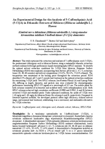 Chandimala, U. R. and Sik, Beatrix and Ajtony, Zsolt (2025) An Experimental Design for the Analysis of 5-Caffeoylquinic Acid (5-CQA) in Ethanolic Extracts of Hibiscus (Hibiscus sabdariffa L.) Flower. GEORGIKON FOR AGRICULTURE: A MULTIDISCIPLINARY JOURNAL IN AGRICULTURAL SCIENCES, 29 (Suppl). pp. 1-16. ISSN 0239-1260