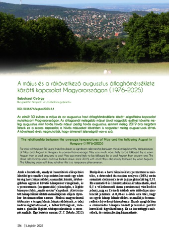 Az elmúlt 50 évben a május és az augusztus havi átlaghőmérséklete között szignififikáns kapcsolat mutatkozott Magyarországon. Az átlagosnál melegebb májust jóval nagyobb eséllyel követte meleg augusztus, mint hűvös, hűvös májust pedig hűvös augusztus, semmint meleg. 2019 óta megtörni látszik ez a szoros kapcsolat, a hűvös májusokat követően is nagyrészt meleg augusztusok jöttek. A következő évek megmutatják, hogy átmeneti jelenségről van-e szó. | For most of the past 50 years, there has been a significant relationship between the average monthly temperatures of May and August in Hungary. A warmer-than-average May was much more likely to be followed by a warm August than a cool one, and a cool May was more likely to be followed by a cool August than a warm one. This close relationship seems to have broken down since 2019, with cool Mays also mostly followed by warm Augusts. The following years will show whether this is a temporary phenomenon.