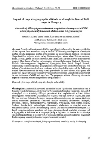 Kassai, Mária Katalin and Kende, Zoltán and Tarnawa, Ákos and Jolánkai, Márton (2025) Impact of crop site geographic altitude on drought indices of field crops in Hungary. GEORGIKON FOR AGRICULTURE: A MULTIDISCIPLINARY JOURNAL IN AGRICULTURAL SCIENCES, 29 (Sup 1). pp. 25-31. ISSN 0239-1260