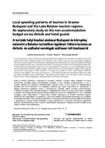 In this exploratory research the local spending differences between the customers of hotels and Airbnb apartments in two Hungarian regions are studied. In this context, the non-accommodation budget of the tourists was focused. The tourists were asked about the share of their non-accommodation spending on local goods and services, providing the basis for comparison in terms of local spending propensity. Primary data was collected through a survey that yielded 103 responses. It was hypothesized that the Airbnb apartment customers spend a larger share of their non-accommodation budget on local goods and services compared to hotel customers. To prove this, Student’s t-test, using RStudio statistical software was applied. The results of the test (p < 0.05) demonstrated the significant difference while box plots provided further confirmation. The findings of this study can assist policy makers aiming to boost tourism while mitigating its negative effects on the local economy. | Ebben a feltáró kutatásban a Budapest és környéke, valamint a Balaton régiós szállodák és Airbnb apartmanok vendégei közötti különbségeket vizsgáljuk a helyi kiadások vonatkozásában. A cikk a turisták szálláson túli kiadásaira összpontosított, melynek során a helyi árukra és szolgáltatásokra fordított rész került elemzésre. Az elsődleges adatokat egy online csatornákon és személyesen is végzett felméréssel gyűjtöttük össze a tanulmányban szereplő régiók turisztikai desztinációiban. A felmérést összesen 103 válaszadó töltötte ki. Feltételezésünk szerint az Airbnb apartmanok vendégei a szálláson túli költségvetésük nagyobb részét fordítják helyi árukra és szolgáltatásokra, mint a szállodák vendégei. Ennek bizonyítására a Student-féle t-próbát alkalmaztuk az RStudio statisztikai szoftver v2024.12.0+467 segítségével. Az adatok (p < 0.05) azt mutatták, hogy jelentős különbség van a szálláson túli költségvetésekben a helyi kiadások tekintetében. A box plotokhoz hasonló adatvizualizációs technikákat is alkalmaztunk, amelyek tovább erősítették a teszt eredményeit. A tanulmány eredményei segíthetnek azoknak a döntéshozóknak, akik a turizmus fellendítésére törekszenek, miközben enyhítik kívánják annak negatív hatásait a helyi gazdaságra.