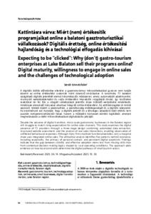 A digitális átállás előretörése ellenére a gasztroturizmus mikrovállalkozásai gyakran nem tudják követni az online értékesítési csatornák iránti növekvő elvárásokat. A tanulmány 73 balatoni szolgáltató digitális jelenlétét elemzi háromlépcsős módszerrel, amely automatizált adatkinyerést, strukturált weboldalelemzést és valós értékesítési interakciók vizsgálatát ötvözi, így torzítatlan reakciókat tár fel. Bár a vizsgált vállalkozások jelentős része működő weboldallal rendelkezik, mindössze elenyésző hányaduk alkalmaz integrált online értékesítést. Az attitűdvizsgálat öt mintát azonosít, többek között a szezonalitást, a személyesség elsődlegességét és a digitális szkepszist. Az eredmények azt mutatják, hogy a digitális jelenlét és a tényleges adaptáció közti eltérés nem pusztán kompetenciahiányból fakad, hanem a működési környezet döntési logikáiból, amelyek meghatározzák a vidéki mikrovállalkozások digitalizációs pályáját. | Despite the advance of digital transition, micro-scale gastronomy businesses in the Balaton region still struggle to match rising expectations for online sales channels. This study examines the digital presence of 73 providers through a three-stage design combining automated data extraction, structured website assessment, and the analysis of real sales interactions, enabling observation of unfiltered behavioural responses. Although many firms maintain functional websites, only a marginal share uses integrated online sales. The attitudinal analysis identifies five patterns behind resistance, including seasonality, the primacy of personal contact, and persistent digital scepticism. Findings indicate that the gap between visibility and effective adoption stems less from missing skills than from contextual decision-making logics shaped by rural operating conditions. The approach adds evidence on how local constraints determine the digital pathways of small tourism actors.