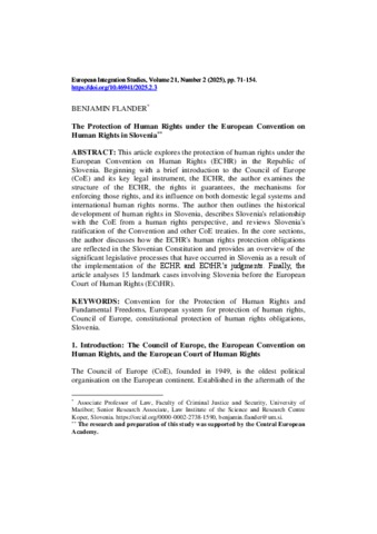 Benjamin, Flander (2025) The Protection of Human Rights under the European Convention on Human Rights in Slovenia. EUROPEAN INTEGRATION STUDIES, 21 (2). pp. 71-154. ISSN 1588-6735