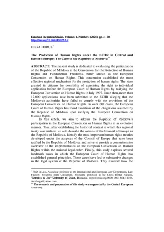 Dorul, Olga (2025) The Protection of Human Rights under the ECHR in Central and Eastern Europe: The Case of the Republic of Moldova. EUROPEAN INTEGRATION STUDIES, 21 (2). pp. 31-70. ISSN 1588-6735