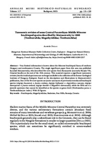 Very limited information is known about the Miocene brachiopod fauna of southernHungary and northeastern Croatia. The single significant paper from this area was publishedby Jakab Matyasovszky, who described five new species from Baranyavár (currently Branjin Vrh,Croatia) locality at the end of the 19th century. This material requires a significant taxonomicrevision, but the studied specimens are no longer available in the collection of the former GeologicalInstitute of Hungary, Budapest. Based on the descriptions and illustrations in Matyasovszky’spublication, four of the five new species are junior synonyms of previously introduced brachiopodspecies (Argiope baanensis = Joania cordata; Argiope hofmanni = Argyrotheca cuneata; Argiopebaranyaense = Joania cordata; Argiope boeckhi = Megathiris detruncata), while the fifth one is ajuvenile specimen that cannot be identified at the species or genus level (Terebratulina parva =Terebratulidae juv. indet.). With 25 figures.