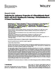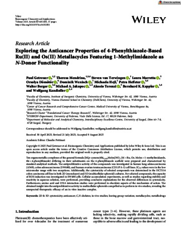 Getreuer, Paul and Mendrina, Theresa and Terwingen, Steven van and Marretta, Laura and Dömötör, Orsolya and Wenisch, Dominik and Hejl, Michaela and Heffeter, Petra and Berger, Walter and Jakupec, Michael A. and Terenzi, Alessio and Keppler, Bernhard K. and Kandioller, Wolfgang (2025) Exploring the Anticancer Properties of 4‐Phenylthiazole‐Based Ru(II) and Os(II) Metallacycles Featuring 1‐Methylimidazole as N ‐Donor Functionality. BIOINORGANIC CHEMISTRY AND APPLICATIONS, 2025 (1). No. 6352081. ISSN 1565-3633