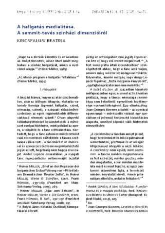 Kricsfalusi, Beatrix (2025) A hallgatás medialitása : A semmit-tevés színházi dimenzióiról = The Mediality of Silence. On the Theatrical Dimensions of Inaction. THEATRON: SZÍNHÁZTUDOMÁNYI PERIODIKA, 19 (1). pp. 64-79. ISSN 1418-9941