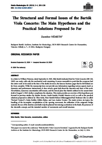Németh, Zsombor (2025) The Structural and Formal Issues of the Bartók Viola Concerto : The Main Hypotheses and the Practical Solutions Proposed So Far. STUDIA MUSICOLOGICA: AN INTERNATIONAL JOURNAL OF MUSICOLOGY OF THE HUNGARIAN ACADEMY OF SCIENCES, 65 (3-4). pp. 205-236. ISSN 1788-6244