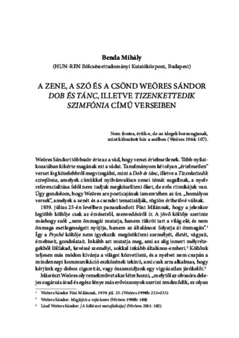 Benda, Mihály (2025) A zene, a szó és a csönd Weöres Sándor a Dob és tánc illetve a Tizenkettedik szimfónia című verseiben. In: "...az elmondatlan s elmondhatatlan..." Tanulmányok Szitár Katalin emlékezetére. ELTE Eötvös József Collegium, Budapest, pp. 313-320. ISBN 9786155897764
