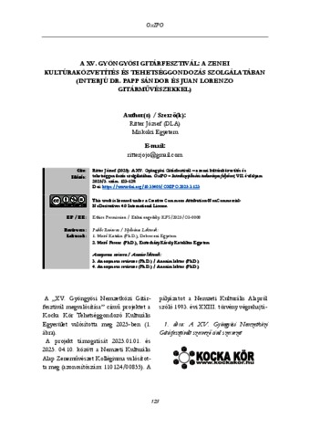 Ritter, József (2025) A XV. Gyöngyösi Gitárfesztivál – a zenei kultúraközvetítés és tehetséggondozás szolgálatában (Interjú Dr. Papp Sándor és Juan Lorenzo gitárművészekkel). OXIPO : INTERDISZCIPLINÁRIS E-FOLYÓIRAT, 7 (3). pp. 123-129. ISSN 2676-8771