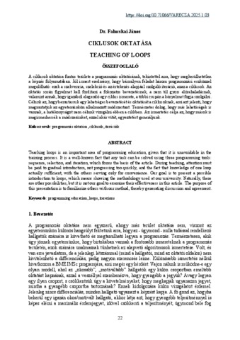 A ciklusok oktatása fontos területe a programozás oktatásának, tekintettel arra, hogy megkerülhetetlen a képzés folyamatában. Jól ismert eredmény, hogy bármilyen feladat három programozási eszközzel megoldható: ezek a szekvencia, szelekció és az értekezés alapjául szolgáló iteráció, azaz a ciklusok. Az oktatás során figyelmet kell fordítani a fokozatos bevezetésnek, a nem túl gyors előrehaladásnak, valamint annak, hogy igazából elegendő egy ciklus ismerete, a többi csupán a kényelmet fogja szolgálni. Célunk az, hogy bemutassuk egy lehetséges bevezetését és oktatását a ciklusoknak, ami azt jelenti, hogy megmutatjuk az egyetemünkön alkalmazott módszertant. Természetes dolog, hogy más lehetőségek is vannak, a hatékonyságot nem célunk vizsgálni ebben a cikkben. Az ismertetés célja az, hogy mások is megismerhessék a módszerünket, ezzel akár vitát, egyeztetést generáljunk. Teaching loops is an important area of programming education, given that it is unavoidable in the training process. It is a well-known fact that any task can be solved using three programming tools: sequence, selection, and iteration, which forms the basis of the article. During teaching, attention must be paid to gradual introduction, not progressing too quickly, and the fact that knowledge of one loop actually sufficient, with the others serving only for convenience. Our goal is to present a possible introduction to loops, which means showing the methodology used at our university. Naturally, there are other possibilities, but it is not our goal to examine their effectiveness in this article. The purpose of this presentation is to familiarize others with our method, thereby generating discussion and agreement.