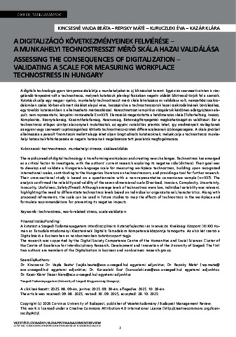 Kincsesné Vajda, Beáta and Repisky, Máté and Kuruczleki, Éva and Kazár, Klára (2026) A digitalizáció következményeinek felmérése – A munkahelyi technostresszt mérő skála hazai validálása = Assessing the consequences of digitalization Validating a scale for measuring workplace technostress in Hungary. VEZETÉSTUDOMÁNY, 57 (1). pp. 2-16. ISSN 0133-0179