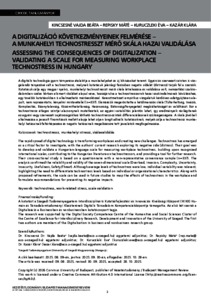 A digitális technológia gyors térnyerése átalakítja a munkahelyeket és új kihívásokat teremt. Egyéni és szervezeti szinten is vizsgálandó tényezővé vált a technostressz, melynek kutatásuk jelenlegi fázisában negatív oldalát (distressz) tárják fel a szerzők. Kutatásuk célja egy magyar nyelvű, munkahelyi technostresszt mérő skála létrehozása és validálása volt, nemzetközi szakirodalomban széles körben elismert skálákat alapul véve, hozzájárulva a technostresszorok hazai szakirodalmának bővüléséhez, egy további kutatásokban is alkalmazható mérőeszközzel. Keresztmetszeti empirikus vizsgálatuk kérdőíves adatgyűjtésen alapult, nem reprezentatív, kényelmi mintavétellel (n=337). Elemzésük megerősítette a hétdimenziós skála (Túlterheltség, Invázió, Komplexitás, Bizonytalanság, Kiszámíthatatlanság, Hasznosság, Biztonság/Fenyegetés) megbízhatóságát és validitását. Bár a technostressz átlagos szintjei alacsonynak mutatkoztak, az egyéni variabilitás jelentős lehet, így eredményeik rávilágítanak az egyéni vagy szervezeti sajátosságokhoz köthető technostressz-szintek differenciálásának szükségességére. A skála jövőbeli alkalmazása a javasolt finomítások mellett alapja lehet olyan longitudinális kutatásoknak, melyek célja a technostressz munkahelyi hatásainak feltérképezése és negatív hatásainak megelőzésére tett javaslatok megfogalmazása. | The rapid spread of digital technology is transforming workplaces and creating new challenges. Technostress has emerged as a critical factor to investigate, with the authors’ current research exploring its negative side (distress). Their goal was to develop and validate a Hungarian-language scale for measuring workplace technostress, building upon recognized international scales, contributing to the Hungarian literature on technostressors, and providing a tool for further research. Their cross-sectional study is based on a questionnaire with a non-representative convenience sample (n=337). The analysis confirmed the reliability and validity of the seven-dimensional scale (Overload, Invasion, Complexity, Uncertainty, Insecurity, Usefulness, Safety/Threat). Although average levels of technostress were low, individual variability was relevant, highlighting the need to differentiate technostress levels based on individual or organizational characteristics. Along with proposed refinements, the scale can be used in future studies to map the effects of technostress in the workplace and formulate recommendations for preventing its negative impacts.
